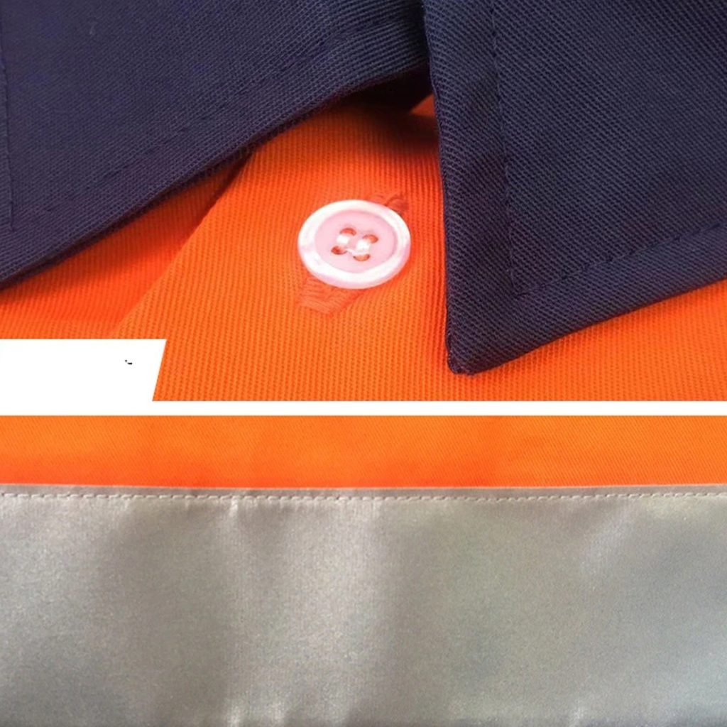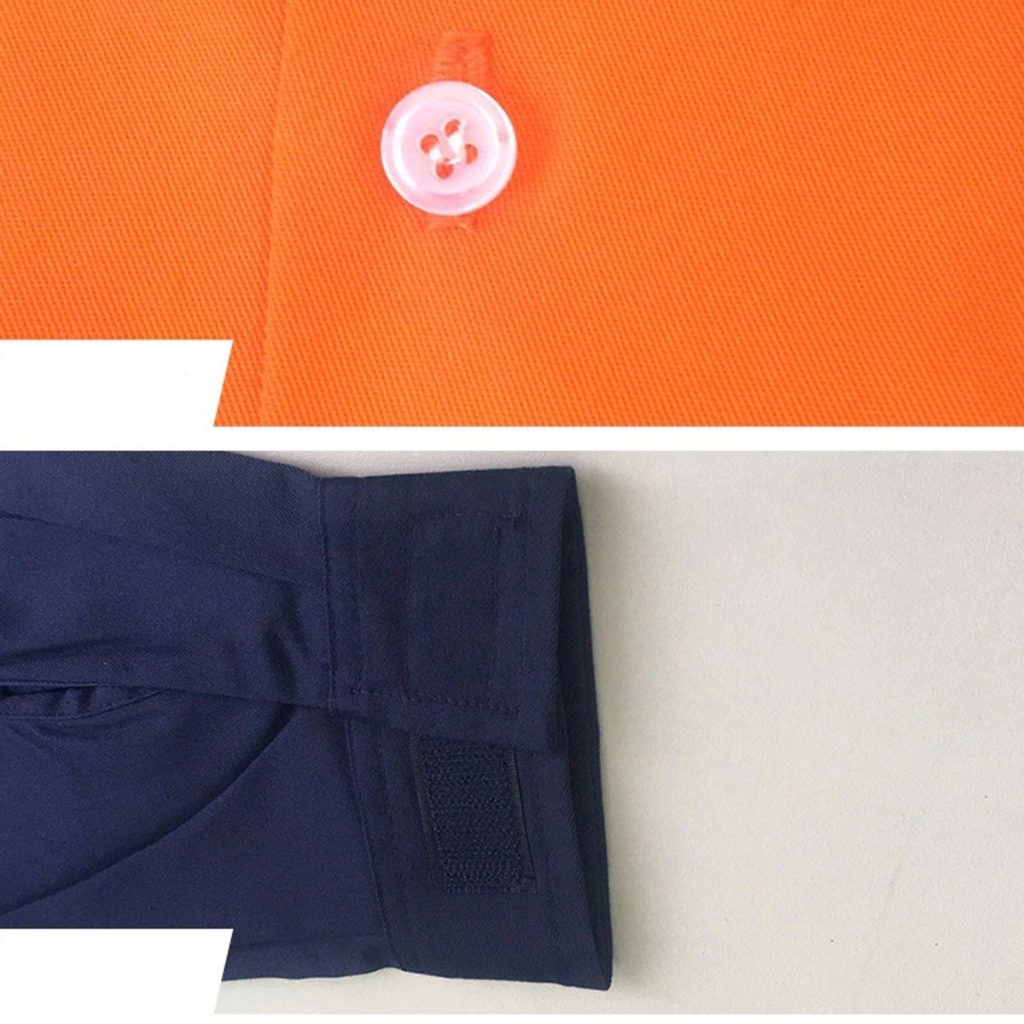 • Work suits are typically fastened up the front with a zipper, button, snap, or velcro, and have pockets and tool loops.
