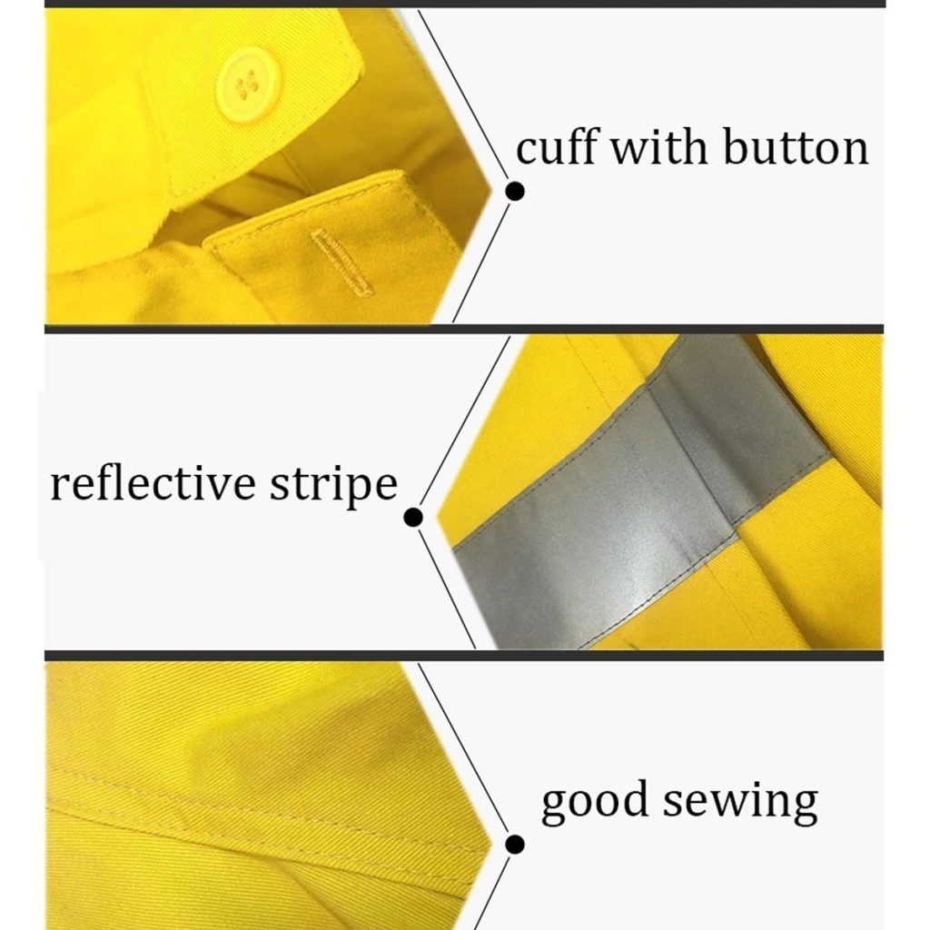 • A work suit protects your legs, chest, shoulders, and arms from harsh weather conditions, chemicals, liquid splashes, dirt, grease, and fire.